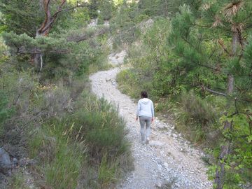 A présent vous êtes sur le sentier qui vous mènera à la cascade. Ce sentier remonte le cours d'eau , alternant les rives ( tantôt rive gauche, tantôt rive droite). A mi-parcours, un gros rocher est à descendre. Parfois le sentier s'éloigne de quelques mètres du cours d'eau.